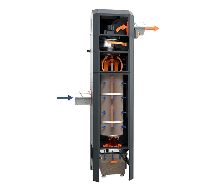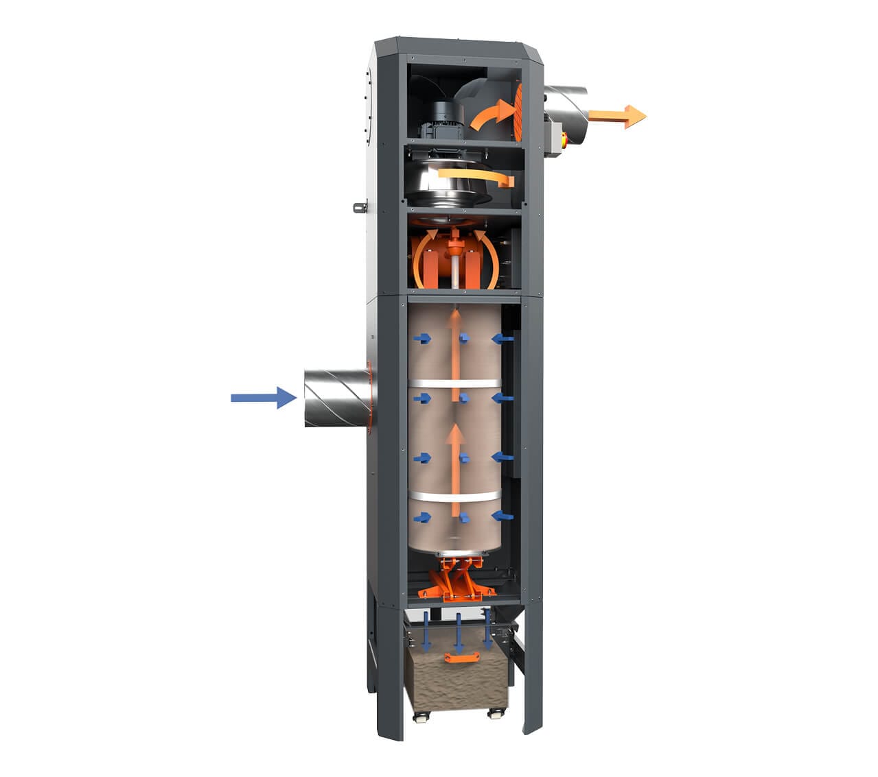 Placing the filters in a vertical orientation along with gravitational pull ensures a higher efficiency when filtering larger, heavier particulates and volumes of dust.
